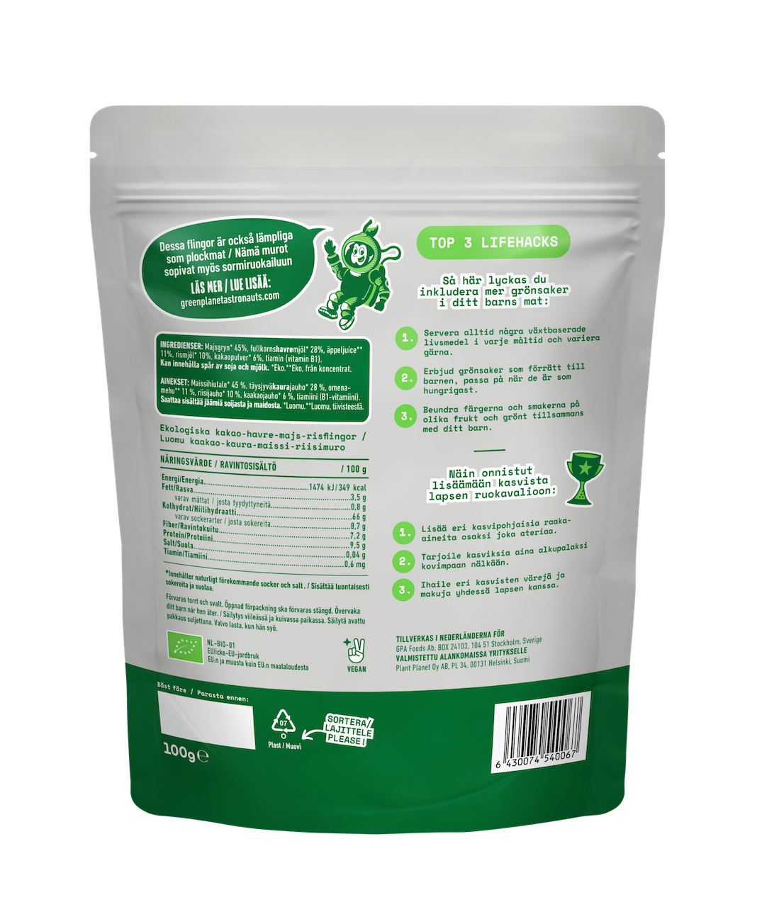 Nämä kaakaon makuiset luomukauramurot syntyivät suomalaisessa kotikeittiössä tarpeesta tehdä erityisesti lapsille sopiva arjen pelastaja ja terveellinen monitoimituote sekä aamupalaksi että sormiruokailuun.