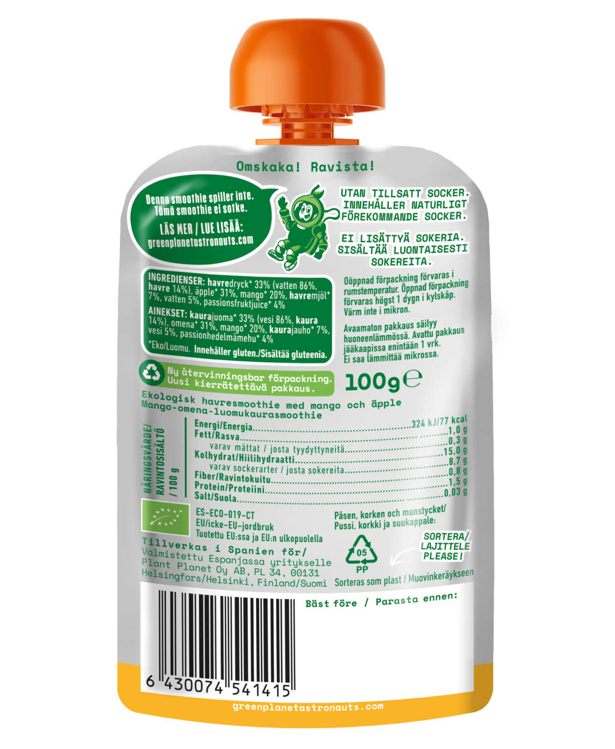 Tämä omena-mango-luomukaurasmoothie syntyi suomalaisessa kotikeittiössä tarpeesta tehdä ruokaisa ja terveellinen välipala, jonka avulla lapset tottuisivat helposti kasvipohjaisiin makuihin. Smoothien luontainen herkullisuus tulee hedelmistä, marjoista, kasviksista sekä täyteläisestä kaurapohjasta, joka sisältää runsaasti suolatonta kaurajuomaa ensimmäisenä maailmassa.