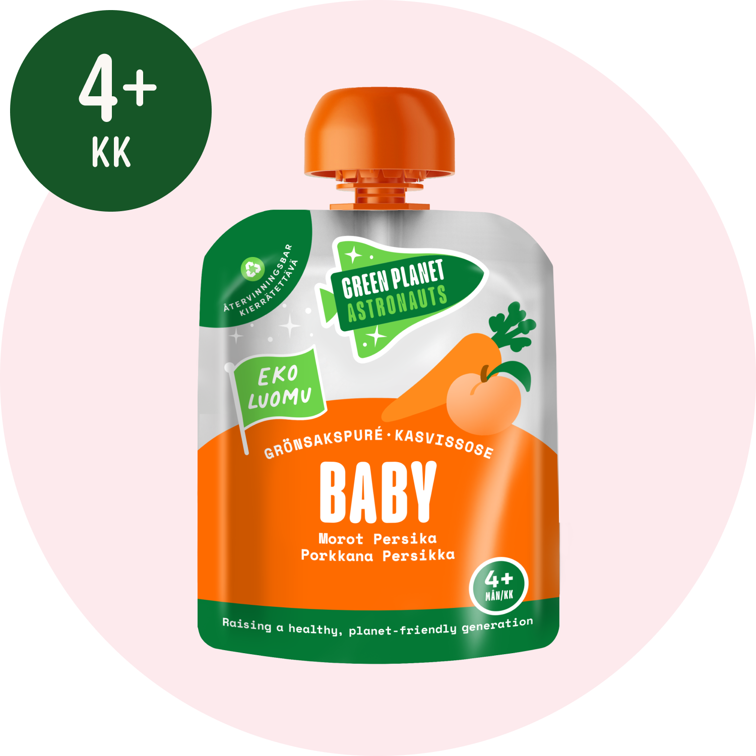 Ravintosuositusten mukaan kiinteiden aloittamisessa kannattaa painottaa vähemmän makeita kasviksia. Luontainen herkullisuus tulee luomuporkkanoista ja -persikoista.